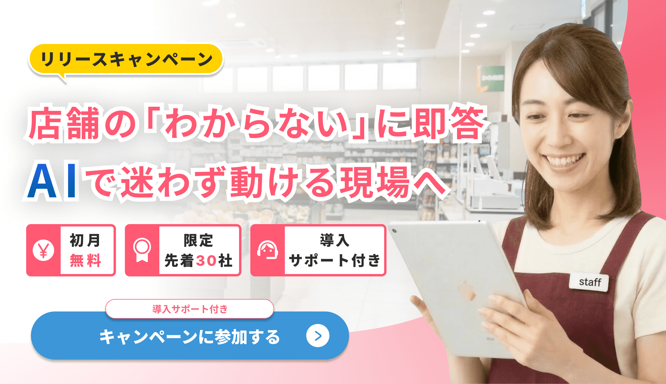 適用タイミング(先着枠の確定): 14日間の無料トライアル終了後、本契約の締結およびお支払い方法のご登録が完了した時点で特典適用(先着30社の枠を消費)となります。(※先着30社に達した場合、期間内であっても予告なく受付を終了する場合がございます)