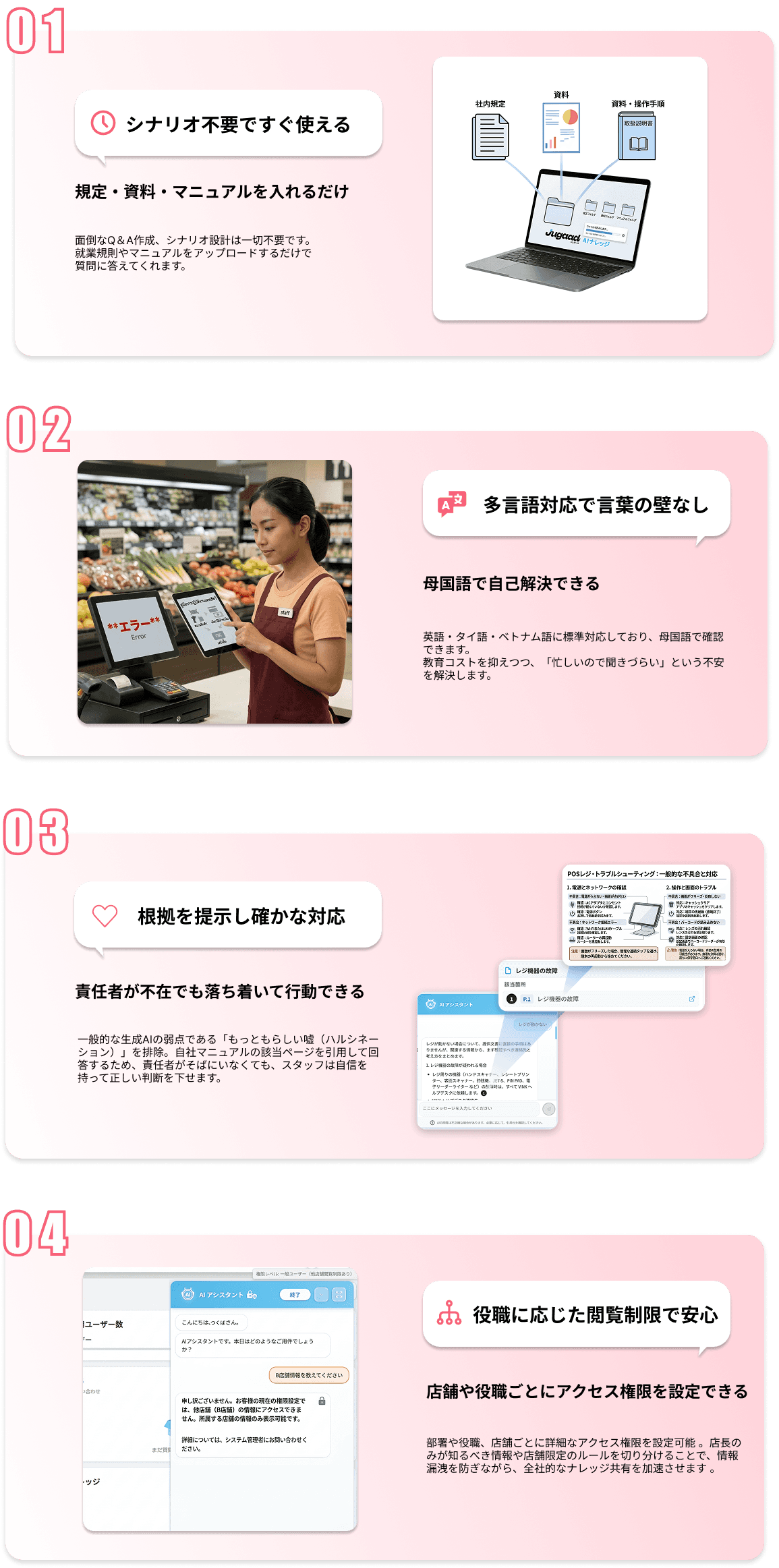A. いいえ、事前の面倒なシナリオ作成は一切不要です 。現在お使いの就業規則、店舗運営マニュアル、商品カタログなどをそのままアップロード(投函)するだけで、AIが内容を理解し、現場からの質問に即答できるようになります 。